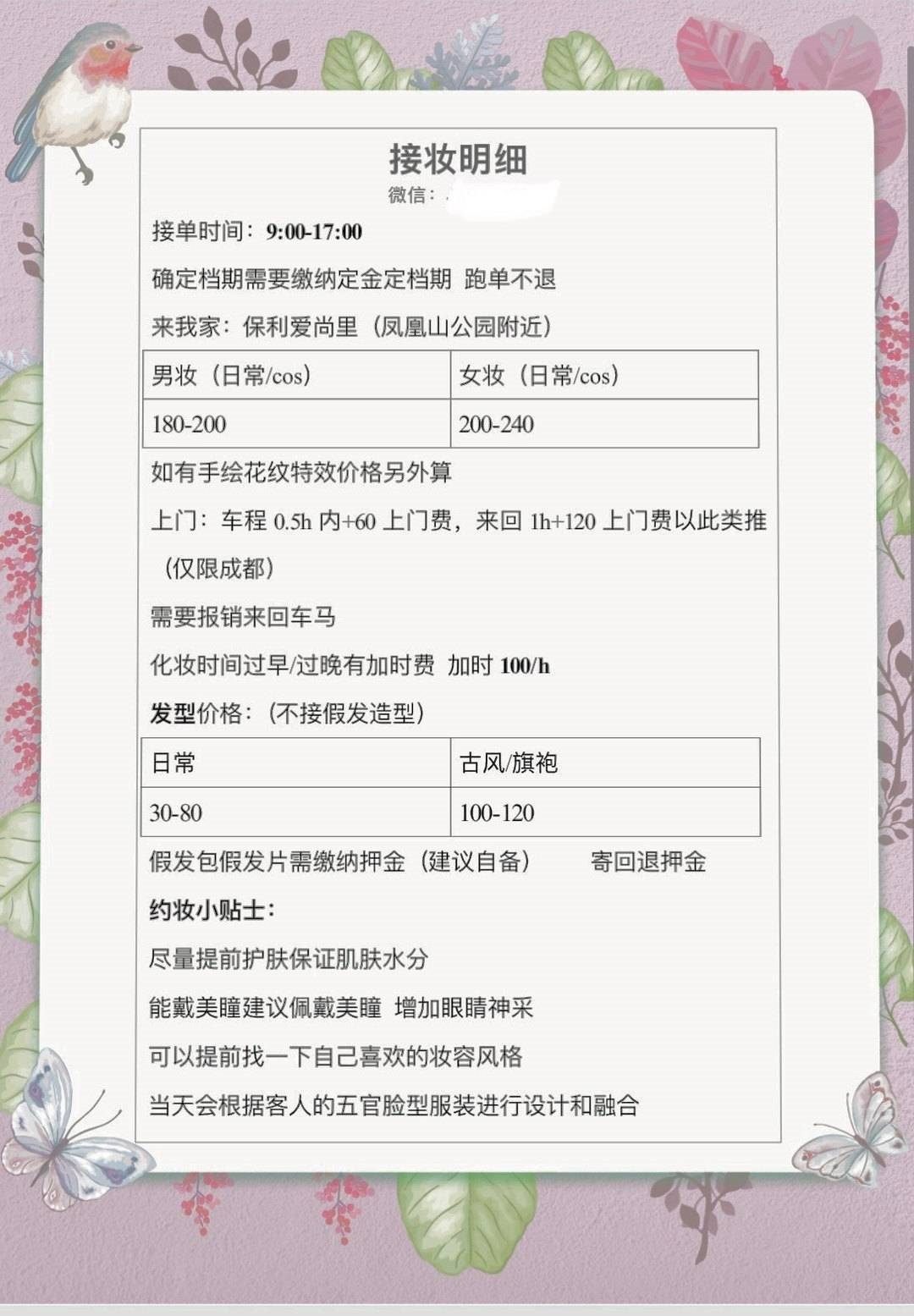 化妝報(bào)價(jià)表