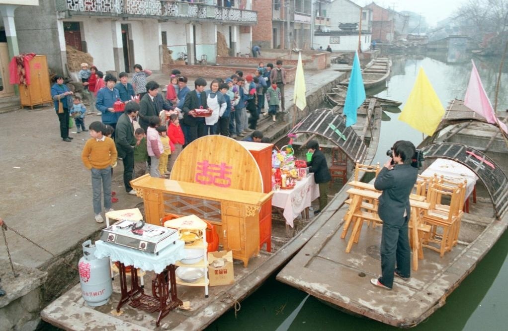 1990年春節(jié)前夕,紹興紅江村的章如花嫁到了一里外的檀瀆村。新郎迎娶新娘所用的交通工具,不是汽車,也不是花轎,而是水鄉(xiāng)里常見的船。富裕起來的水鄉(xiāng)農民在遵循傳統禮儀的同時,也為婚禮增添了現代色彩。比如,陪嫁中少不得電視、煤氣罐;新娘少不得燙發(fā);另一件少不得的,是用攝像機記錄下婚禮的全部過程,作為一輩子的紀念。