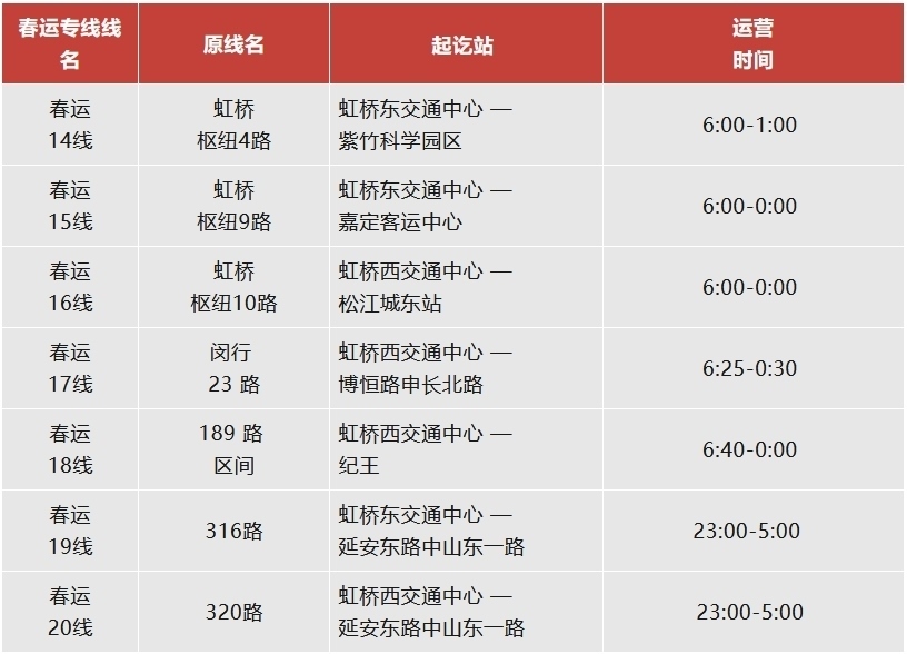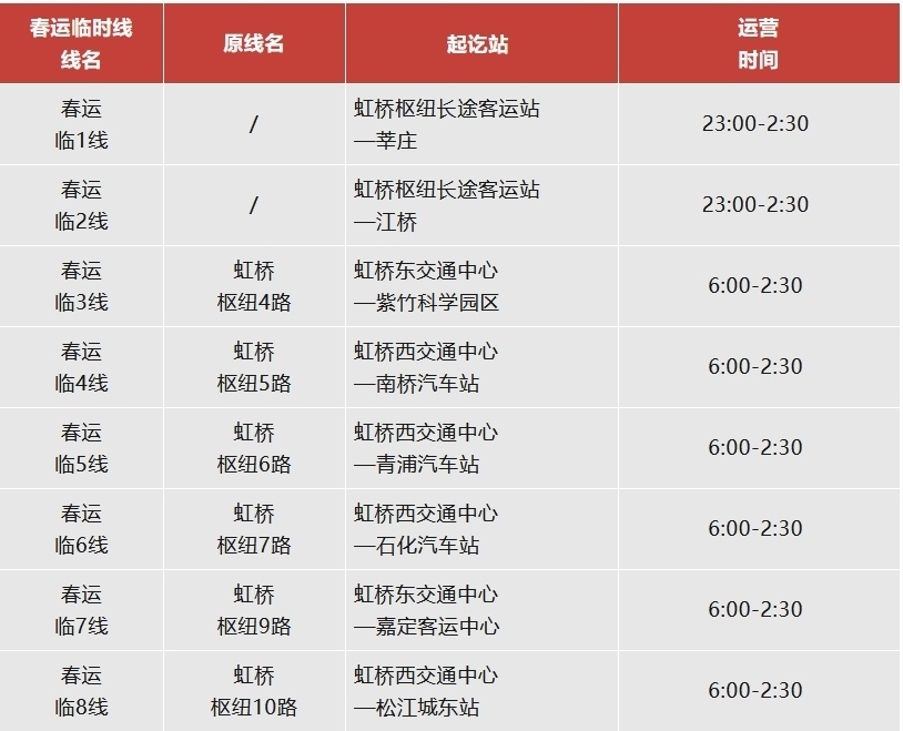 注:虹橋樞紐春運(yùn)專(zhuān)線運(yùn)營(yíng)日期為2月14日至3月5日。