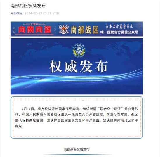 ·南部戰(zhàn)區(qū)回應(yīng)菲方組織所謂“聯(lián)合空中巡邏”:情況盡在掌握,戰(zhàn)區(qū)部隊(duì)保持高度警惕。