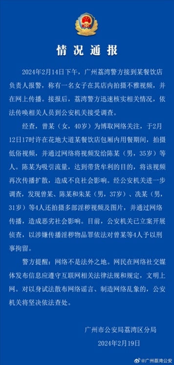 ·廣州警方通報(bào)女網(wǎng)紅在海底撈做不雅行為:4人被刑拘。