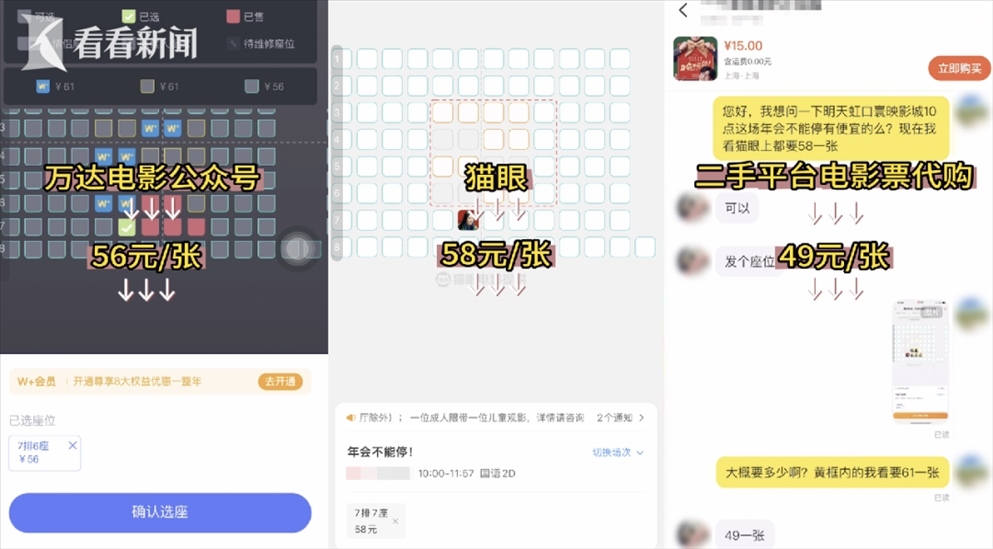 為了求證這一說(shuō)法,記者來(lái)到了網(wǎng)友爆料的這家電影院,并提前通過(guò)三種渠道在線(xiàn)上購(gòu)入了同天、同電影院、同場(chǎng)次、同排位置的三張電影票,分別花費(fèi)了56元、58元、49元。