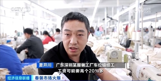 廣東深圳某服裝工廠車位縫紉工 夏開川:比淡季的時(shí)候工資可能要高20%多。現(xiàn)在(車位縫紉工)一個(gè)月1萬(wàn)多元。