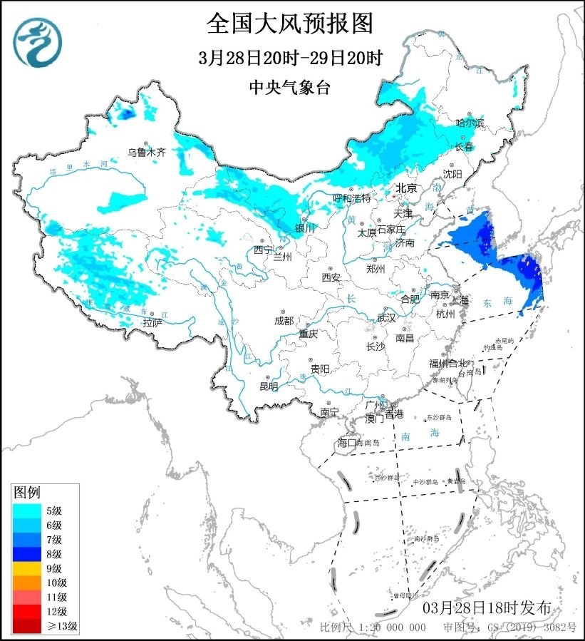 預計,3月28日20時至29日20時,內(nèi)蒙古大部、吉林西部、遼寧南部、甘肅東部、寧夏北部等地有5~6級、陣風7~9級風;黃海中部和南部海域、東海東北部海域將有6~8級、陣風9級風,其中東海東北部的部分海域風力可達9級、陣風10級。