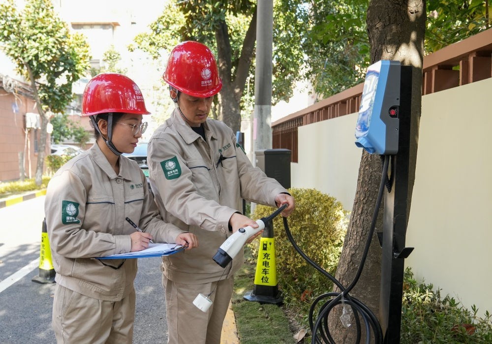 2023年11月29日,在上海市徐匯區(qū)田林十三村小區(qū)內(nèi),國(guó)網(wǎng)上海市南供電公司的工作人員在檢查充電樁運(yùn)行情況。新華社記者 丁汀 攝