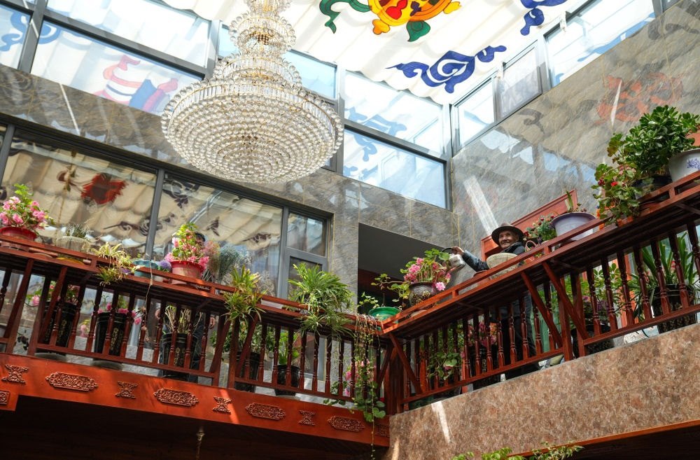 朗杰在自家二樓給花澆水(3月13日攝)。新華社記者 晉美多吉 攝