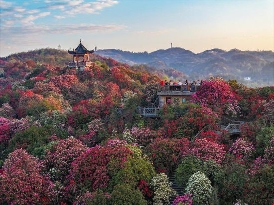 貴州烏蒙山區(qū),百里杜鵑景區(qū)的野生杜鵑花相繼綻放,如同一條彩帶飄舞山間,這里有面積大、種類多、保存完好的原始杜鵑林。景區(qū)管理單位舉行了祭花神等豐富的民俗活動(dòng)。