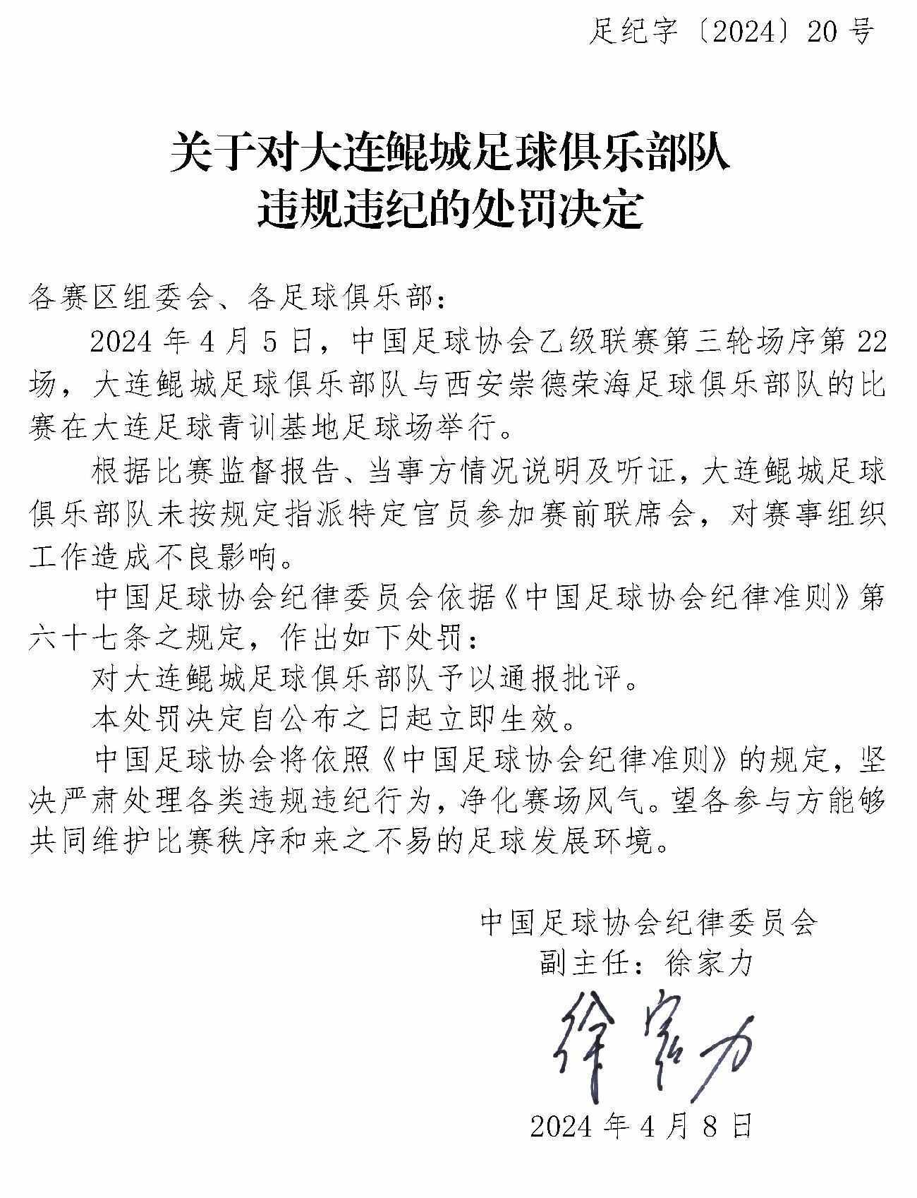央視網(wǎng)消息:4月10日,中國(guó)足協(xié)網(wǎng)站發(fā)布《關(guān)于對(duì)上海嘉定匯龍足球俱樂(lè)部隊(duì)球員時(shí)間違規(guī)違紀(jì)的處罰決定》《關(guān)于對(duì)西安崇德榮海足球俱樂(lè)部隊(duì)違規(guī)違紀(jì)的處罰決定》《關(guān)于對(duì)大連鯤城足球俱樂(lè)部隊(duì)違規(guī)違紀(jì)的處罰決定》三份處罰決定。中甲聯(lián)賽上海嘉定匯龍9號(hào)球員因暴力行為被停賽罰款。中乙聯(lián)賽大連鯤城與西安崇德榮海兩家俱樂(lè)部因未按規(guī)定指派特定官員參加賽前聯(lián)席會(huì),被通報(bào)批評(píng)。