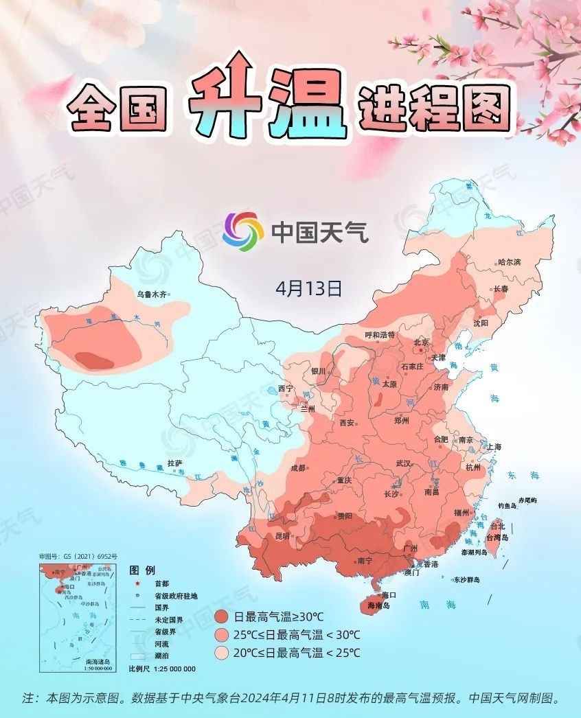 眼下,全國大部處于冷空氣影響間歇期,升溫是主旋律。預(yù)計(jì)今起三天(4月11日至13日),我國從北到南都將開啟回暖進(jìn)程,最高氣溫25℃以上的區(qū)域幾乎覆蓋整個(gè)中東部,波及20余省份,東北、西北地區(qū)氣溫將大面積創(chuàng)今年以來新高,北方不少地方還會(huì)體驗(yàn)到常年5月中旬才有的超前暖熱。中國天氣網(wǎng)推出全國升溫進(jìn)程圖,看看哪些地方將沖擊30℃。