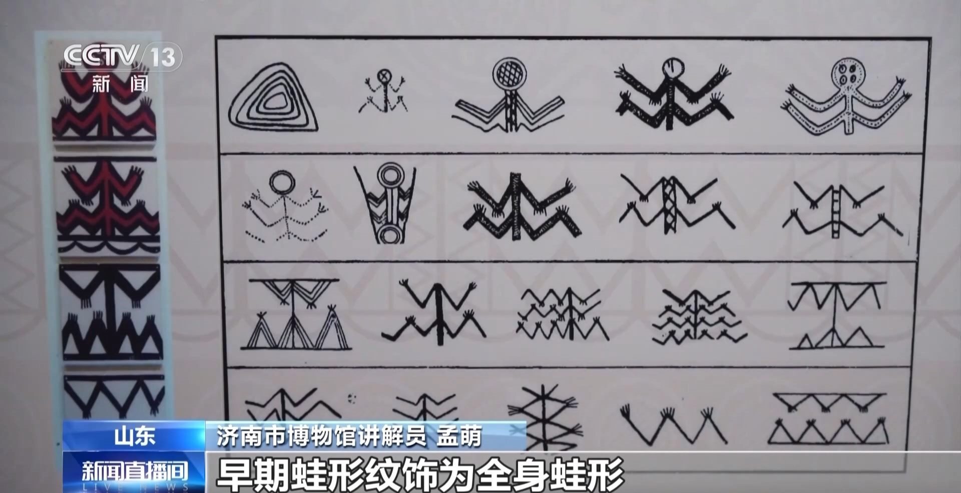 濟(jì)南市博物館講解員 孟萌:早期蛙形紋飾為全身蛙形,在這一時期蛙頭部往往是圓圈形,里面繪有不同的圖案,而它的四肢往往是波狀紋,并且它的足是有不同的趾,到了中期則變得更為簡化和自然,而到了晚期變成了一種結(jié)構(gòu)化的圖案。體現(xiàn)了他們希望自己的部落能夠繁衍生息、發(fā)展壯大的美好愿景。