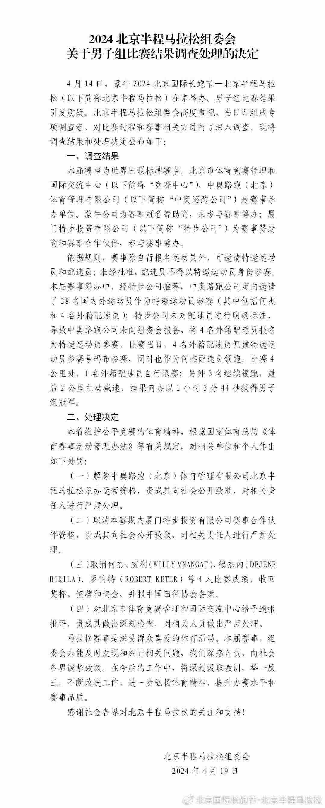 央視網(wǎng)消息:據(jù)@北京國際長跑節(jié)-北京半程馬拉松 微博消息,2024北京半程馬拉松組委會發(fā)布關(guān)于男子組比賽結(jié)果調(diào)查處理的決定。詳情如下: