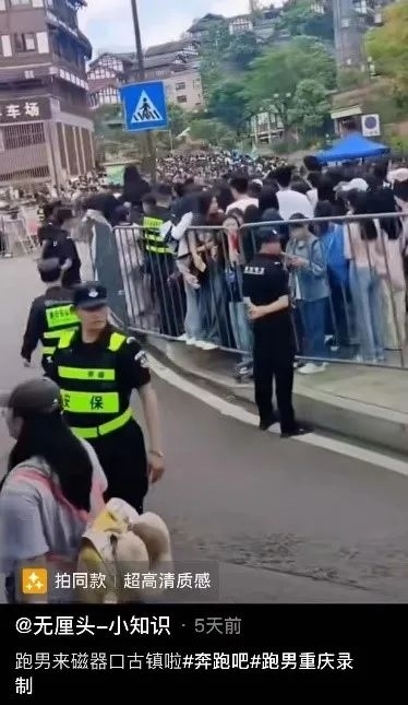根據(jù)視頻顯示的“磁器口停車場(chǎng)”檢索視頻平臺(tái)相關(guān)內(nèi)容,有不少網(wǎng)友在4月19日發(fā)布了綜藝節(jié)目《奔跑吧》在當(dāng)?shù)劁浿茣r(shí)的畫面,通過(guò)比對(duì)可以發(fā)現(xiàn),網(wǎng)傳視頻中出現(xiàn)的圍欄、安保分布情況、以及圍欄上懸掛的不同顏色應(yīng)援橫幅等元素都與路人拍攝的清晰版視頻一致。