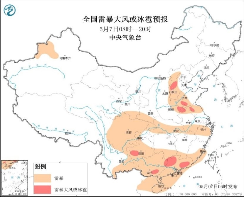 另外,今天白天,河北中部、山東西南部、河南東部、安徽北部、江蘇北部、貴州西南部、廣西中南部、廣東中北部等地的局地將有雷暴大風(fēng)或冰雹天氣,提醒當(dāng)?shù)毓娨⒁夥烙箫L(fēng)或冰雹天氣。