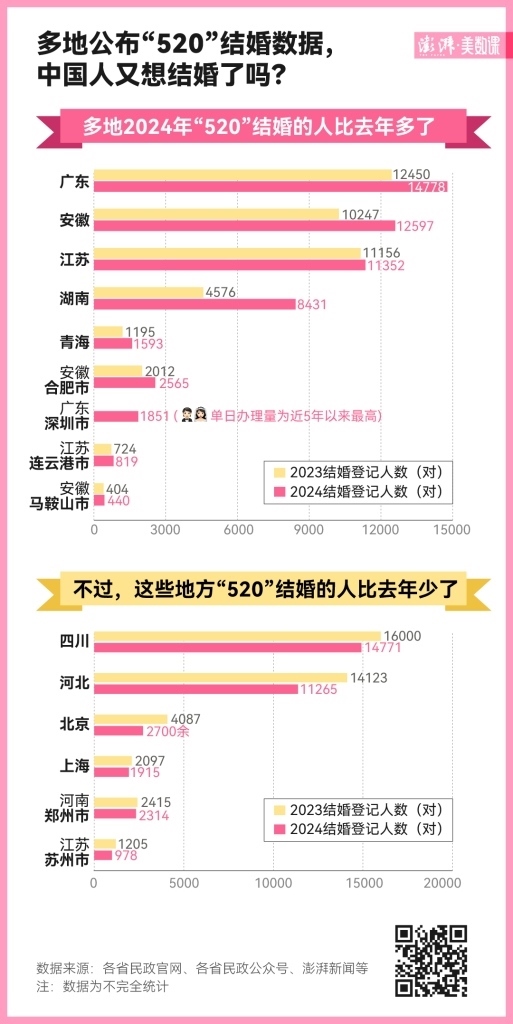 2023 年多地“520”領證人數(shù)下跌,引起熱議。2024 年的“520”剛剛過去,多地披露了當日結婚登記數(shù)。廣東、安徽、江蘇等省當日領證人數(shù)較去年有回升。澎湃新聞從深圳市民政局獲悉,截至 5 月 20 日 18 時 30 分,“520”全天共辦理結婚登記 1851 對,單日辦理量為近 5 年以來最高。中國人又重燃對婚姻的渴望了嗎?