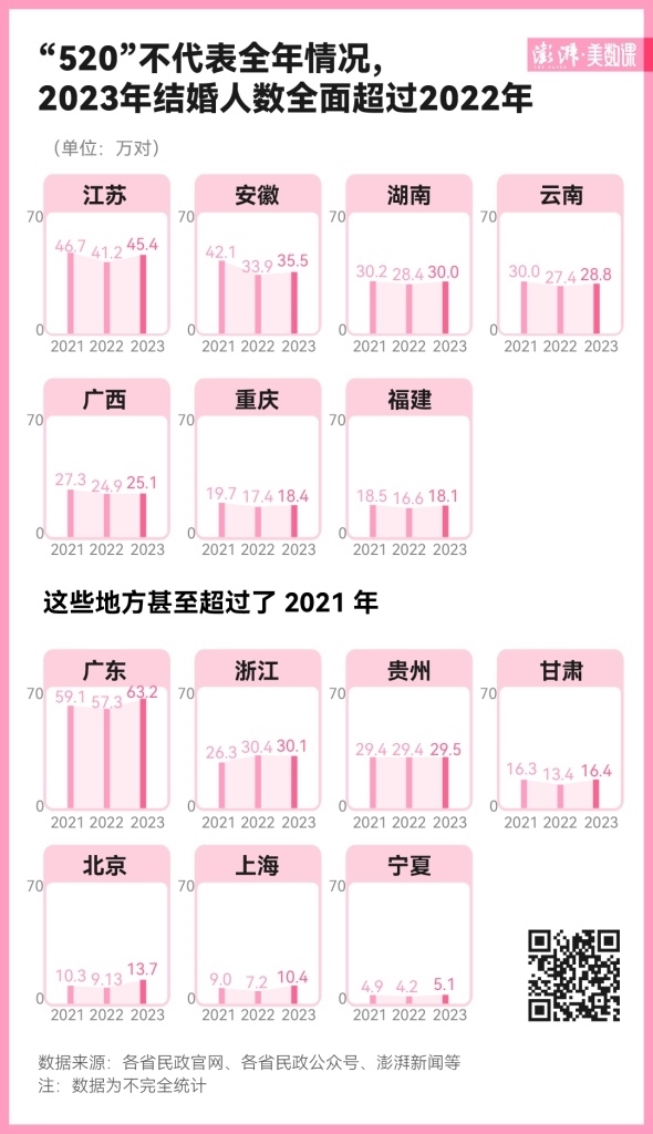 2023 年多地的“520”領證人數(shù)下跌,媒體報道稱“年輕人不太愿為愛結婚了”,但實際上,全年情況卻沒這么慘淡。