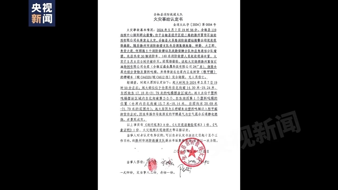 記者從全椒縣消防救援大隊(duì)于5月24日出具的火災(zāi)事故認(rèn)定書上發(fā)現(xiàn),5月7日晚上7點(diǎn)多,滁州富信助劑有限公司倉庫發(fā)生火災(zāi),滁州市消防救援支隊(duì)調(diào)集30輛消防車、140名消防救援人員現(xiàn)場(chǎng)處置,火災(zāi)于5月8日0時(shí)許撲滅。經(jīng)現(xiàn)場(chǎng)勘驗(yàn),該起火災(zāi)燒損滁州富信石油助劑有限公司倉庫、燒毀倉庫內(nèi)部分貨物及塑料噸桶,并將停放在倉庫內(nèi)正在卸粗甲醇的槽罐車完全燒毀,無人員傷亡。