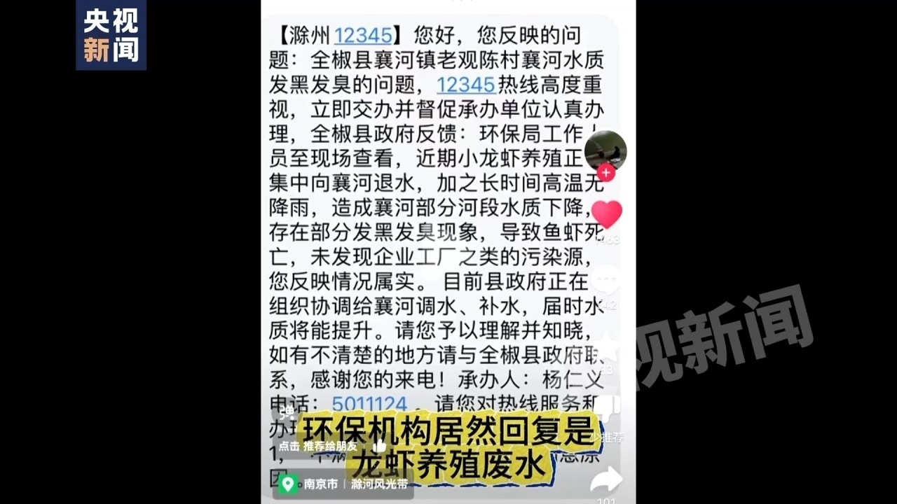 記者:但是我看到了有一個(gè)滁州12345,關(guān)于全椒縣襄河鎮(zhèn)老觀陳村襄河水質(zhì)發(fā)黑發(fā)臭問題的回復(fù),留的承辦人叫楊仁義。