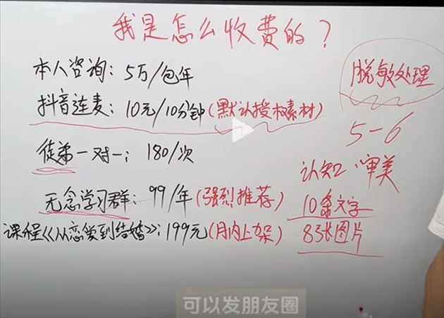 此外,不少婚戀軍師都公開了聯(lián)系方式,通過提供一對一指導(dǎo)、付費(fèi)視頻、情感課程、收徒、經(jīng)營朋友圈教學(xué)等形式斂金,且價格不菲。