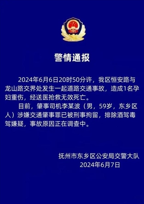 ·江西警方通報一起致孕婦身亡交通事故:肇事司機被刑事拘留。