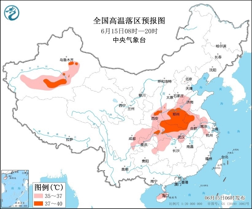預(yù)計(jì)6月15日白天,新疆南疆盆地、陜西中南部、山西南部、河北南部、山東西部、河南、安徽、江蘇西部、湖北、湖南西北部、四川盆地、海南島等地有35~36℃高溫天氣,其中,新疆南疆盆地、陜西中部、河南、安徽西北部、湖北北部、重慶東北部、海南島西北部等地部分地區(qū)最高氣溫可達(dá)37~40℃。