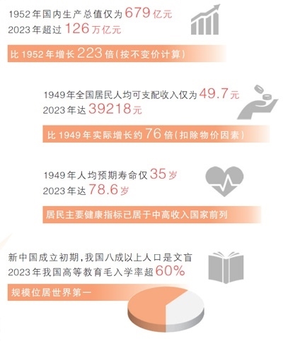 各行各業(yè)的發(fā)展成就,人民生活的蒸蒸日上,濃縮在一組組數(shù)據(jù)中。與新中國(guó)成立初期相比,2023年國(guó)內(nèi)生產(chǎn)總值增長(zhǎng)223倍、人均GDP增長(zhǎng)89倍、人均預(yù)期壽命提高43.6歲、農(nóng)村貧困人口全部脫貧……國(guó)家統(tǒng)計(jì)局近日發(fā)布新中國(guó)成立75年經(jīng)濟(jì)社會(huì)發(fā)展成就系列報(bào)告,“數(shù)”說75年偉大成就,本版“大數(shù)據(jù)觀察”欄目推出特別報(bào)道,記錄同心同德、艱苦奮斗的奮進(jìn)歷程,匯聚共襄強(qiáng)國(guó)建設(shè)、民族復(fù)興偉業(yè)的磅礴力量。