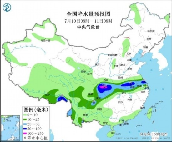 全國(guó)降水量預(yù)報(bào)圖(7月10日08時(shí)-11日08時(shí))