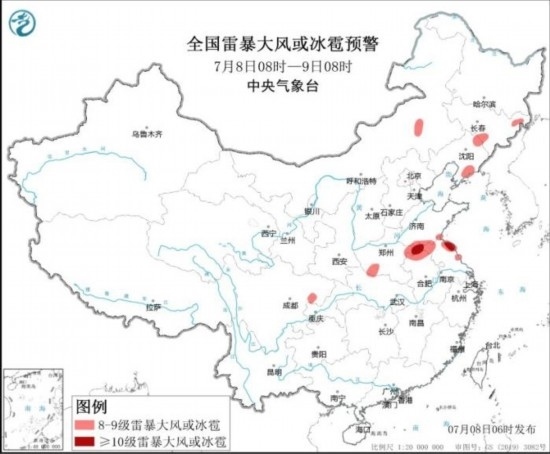 全國(guó)雷暴大風(fēng)或冰雹預(yù)警(7月8日08時(shí)-9日08時(shí))