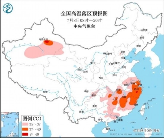 全國(guó)高溫落區(qū)預(yù)報(bào)圖(7月8日08時(shí)-20時(shí))