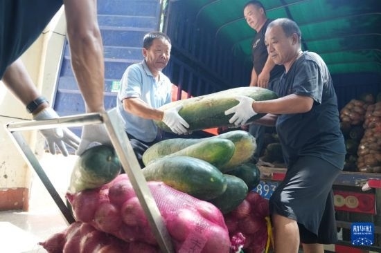 7月7日,工作人員在華容縣職業(yè)中專安置點搬運社會捐贈的農(nóng)產(chǎn)品。