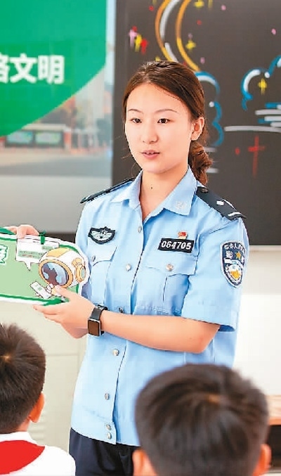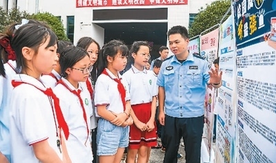 江西省宜春市公安局袁州分局鳳凰派出所民警在黃頗小學向?qū)W生講解防范網(wǎng)絡詐騙等知識。周 亮攝(人民視覺)