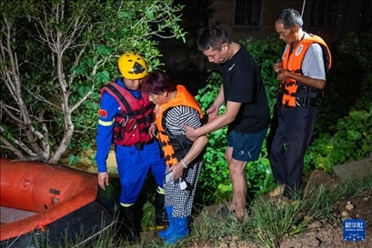 凌晨2時(shí)許,記者在決口現(xiàn)場看到,由于道路狹窄,通行不便,消防隊(duì)員扛著救生艇向受災(zāi)區(qū)域挺進(jìn),不斷有受災(zāi)群眾乘坐救生艇被轉(zhuǎn)移至安全地帶。
