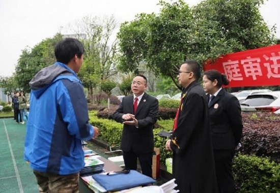 圖為重慶市渝北區(qū)人民法院在一起到企業(yè)現(xiàn)場(chǎng)開(kāi)庭的勞動(dòng)爭(zhēng)議案結(jié)束后,為勞動(dòng)者普及法律知識(shí)、提供法律咨詢(xún)。 劉霞 攝