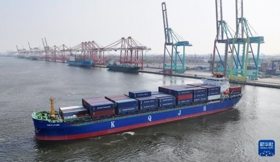 8月24日,“康琦嘉鴻”輪從天津港第二集裝箱碼頭離泊(無人機(jī)照片)。