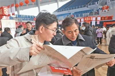 2月3日,求職者在江蘇省揚(yáng)州市寶應(yīng)縣新春大型人力資源招聘洽談會(huì)上尋找就業(yè)崗位。