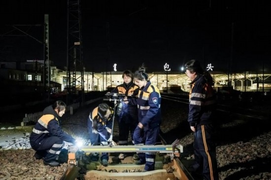 包頭工務(wù)段“女子監(jiān)控分析班組”正在進行現(xiàn)場作業(yè)。(王日森 攝)