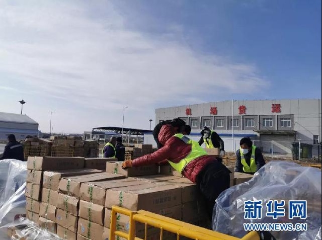 物資在呼和浩特白塔機(jī)場集結(jié)后,20多名物流公司工作人員冒著星夜寒風(fēng),在停機(jī)坪上操作打板,將物資裝機(jī)。