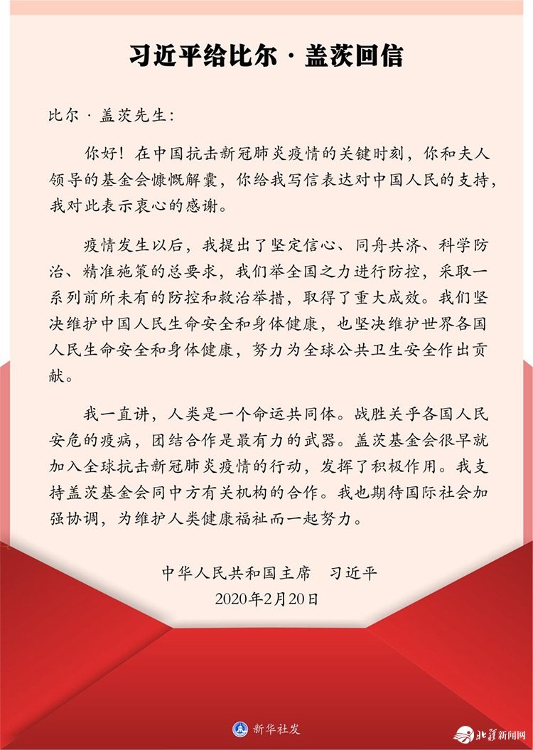2月20日,在給美國(guó)蓋茨基金會(huì)聯(lián)席主席比爾·蓋茨的回信中,習(xí)近平主席這樣寫道。
