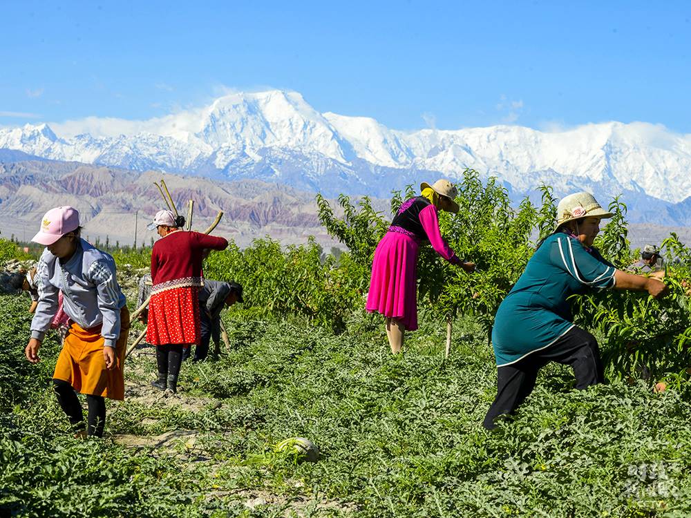 △新疆阿克陶縣村民在林果基地為桃樹打枝,林間同時套種了西瓜。
