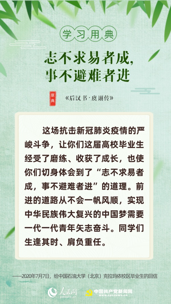 【編者按】“志不求易者成,事不避難者進(jìn)。”近日,習(xí)近平總書記給中國石油大學(xué)(北京)克拉瑪依校區(qū)畢業(yè)生回信,對廣大高校畢業(yè)生提出殷切期望?!叭松谇?,勤則不匱”“積土而為山,積水而為?!薄陙?,習(xí)近平多次引用詩句典故,激勵包含廣大青年在內(nèi)的全黨全國各族人民拼搏奮進(jìn)、埋頭苦干。正值“戰(zhàn)疫”“戰(zhàn)貧”關(guān)鍵時刻,人民網(wǎng)·中國共產(chǎn)黨新聞網(wǎng)與您一起回顧習(xí)近平講話中關(guān)于“奮斗”的10個名句。