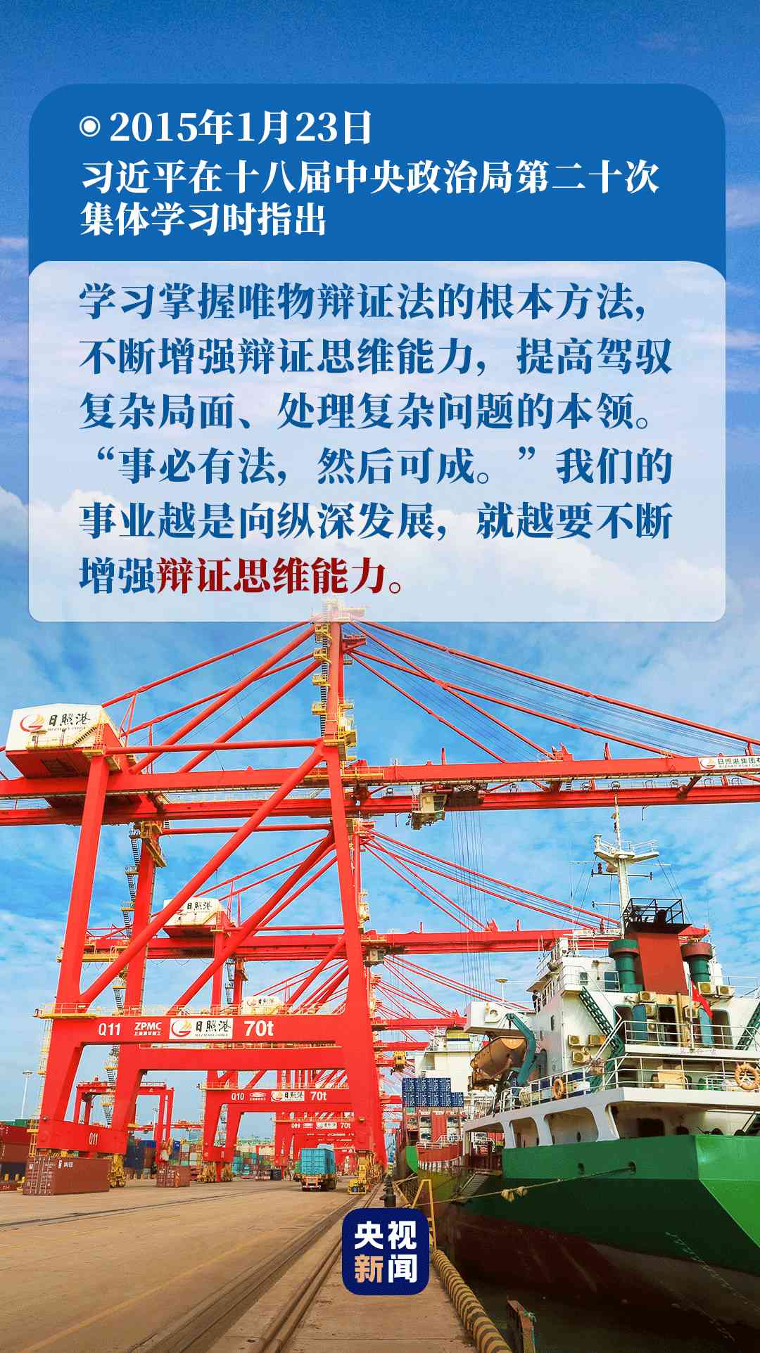 “要堅持發(fā)展地而不是靜止地、全面地而不是片面地、系統(tǒng)地而不是零散地、普遍聯(lián)系地而不是單一孤立地觀察事物,妥善處理各種重大關(guān)系?!?015年1月23日,習(xí)近平在十八屆中央政治局第二十次集體學(xué)習(xí)時的講話中,對如何在實(shí)際工作中運(yùn)用唯物辯證法,作出了深刻闡述。
