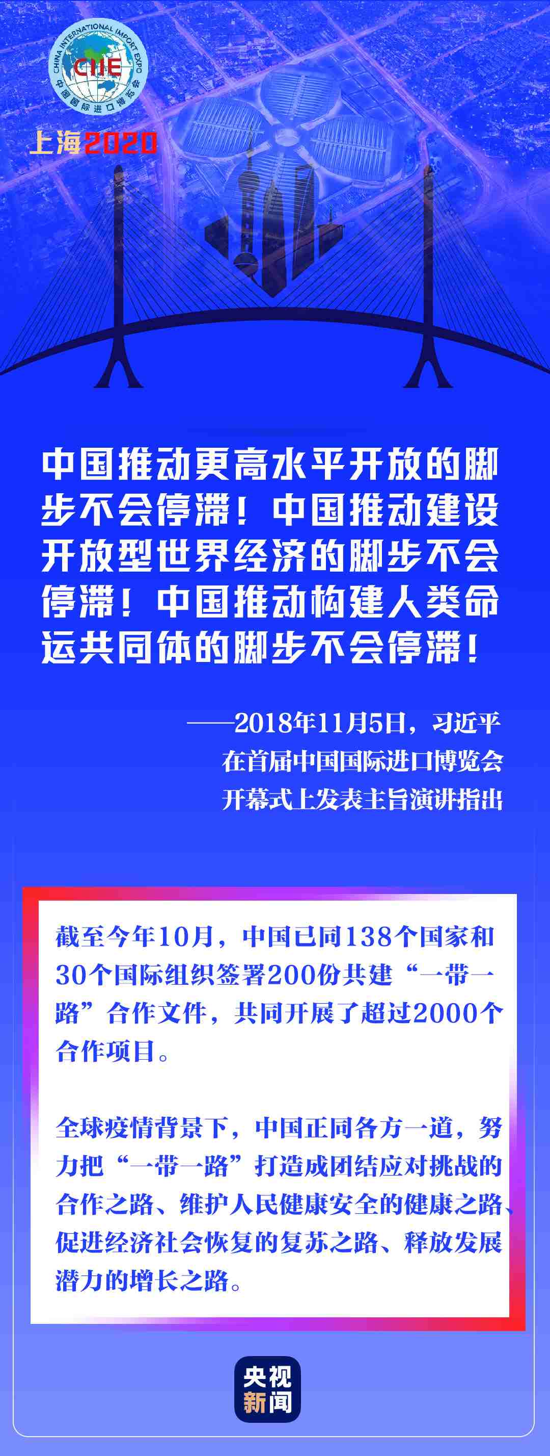 在新冠肺炎疫情全球蔓延、世界經(jīng)濟(jì)持續(xù)低迷的非常時(shí)期,進(jìn)博會(huì)如期而至,為世界各國各地區(qū)搭建通往更多市場(chǎng)機(jī)遇、投資機(jī)遇、增長(zhǎng)機(jī)遇的橋梁。
