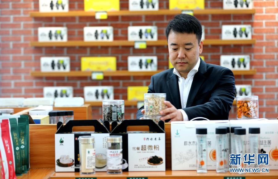 2020年4月21日,秦嶺天下電子商務(wù)有限公司總經(jīng)理趙少康在金米村培訓(xùn)中心整理貨架。新華社記者 梁愛平 攝