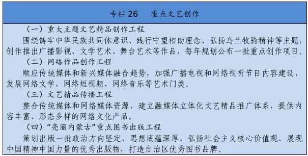 堅持以人民為中心的創(chuàng)作導向,創(chuàng)作生產出人民喜聞樂見的優(yōu)秀作品。繁榮發(fā)展新聞出版、廣播影視、文學藝術,實施文藝作品質量提升工程,加強優(yōu)秀劇本孵化和生活采風。推動重大主題文藝精品創(chuàng)作,加強現實題材創(chuàng)作生產。改進重點作品創(chuàng)作引導機制,建立重點文化藝術項目滾動扶持機制。設立內蒙古文化藝術發(fā)展專項資金。加強文化文藝場館建設。制定文藝人才發(fā)展規(guī)劃,開展內蒙古電影新導演計劃。實施文化潤心工程,以文藝創(chuàng)作鑄牢中華民族共同體意識。提升廣播電視和網絡視聽產品質量,豐富網絡文藝內容。搭建文藝精品遴選、展示、推出平臺,建設內蒙古音樂廳,支持因地制宜建設綜合劇場、音樂廳和美術館,舉辦內蒙古藝術節(jié)、內蒙古音樂節(jié)等活動,大力實施文藝惠民演出和地方戲傳承創(chuàng)新工程,定期舉辦全區(qū)地方戲優(yōu)秀劇目展演以及音樂、舞蹈、小戲小品專業(yè)賽事,打造獨具特色的文化藝術品牌。