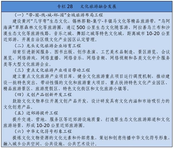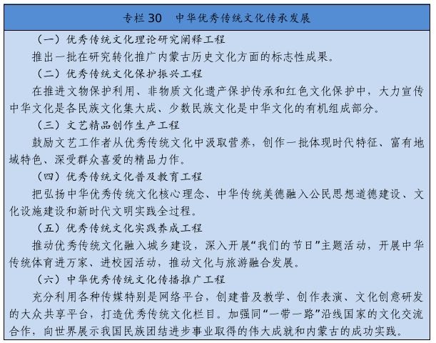 建立健全把社會效益放在首位、社會效益和經濟效益相統(tǒng)一的文化創(chuàng)作生產體制機制。完善文化管理體制和生產經營機制。健全現代文化產業(yè)體系和市場體系。完善文化和旅游融合發(fā)展體制機制。推進內蒙古藝術劇院等國有文藝院團和烏蘭牧騎改革。完善文化企業(yè)履行社會責任制度,健全引導新型文化業(yè)態(tài)健康發(fā)展機制。深化國有文化企業(yè)改革,加快重組整合、結構調整、多元化發(fā)展。健全文物保護利用法律制度和標準規(guī)范。設立文化產業(yè)發(fā)展專項資金。