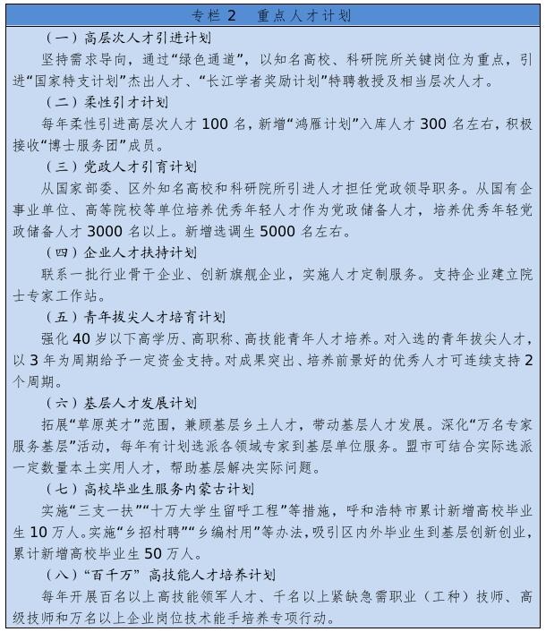 著力抓好高層次創(chuàng)新型領軍人才、青年拔尖人才、高技能人才、各類急需緊缺人才隊伍建設。實施人才工程計劃,選拔推薦全國杰出專業(yè)技術人才、政府特殊津貼專家、國家百千萬人才工程人選,組織評選自治區(qū)杰出人才獎、突出貢獻專家、青年創(chuàng)新人才獎,選拔培養(yǎng)自治區(qū)“草原英才”工程、新世紀321人才工程、511人才培養(yǎng)工程人選。實施專業(yè)技術人才知識更新工程。加強基層專業(yè)技術人才隊伍建設,引導人才向基層一線和艱苦地區(qū)流動。實施“百千萬”高技能人才培養(yǎng)計劃。