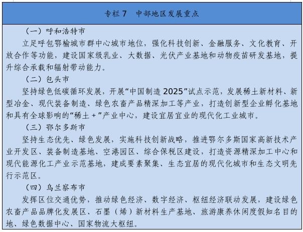 高標準打造稀土新材料、乳業(yè)國家技術創(chuàng)新中心,在優(yōu)勢特色產業(yè)領域培育一批國家重點實驗室,布局建設自治區(qū)重點實驗室、工程研究中心、產業(yè)創(chuàng)新中心、技術創(chuàng)新中心,構建形成創(chuàng)新平臺體系。高質量建設呼包鄂國家自主創(chuàng)新示范區(qū)、鄂爾多斯國家可持續(xù)發(fā)展議程創(chuàng)新示范區(qū)和巴彥淖爾國家農業(yè)高新技術產業(yè)示范區(qū)。重點實施國家級高新區(qū)“提質進位”行動,爭取包頭稀土、呼和浩特金山、鄂爾多斯三個國家級高新技術產業(yè)開發(fā)區(qū)在全國高新技術開發(fā)區(qū)排名晉升5個位次。開展自治區(qū)級高新區(qū)“促優(yōu)培育”行動,推動赤峰、阿拉善、通遼高新區(qū)升級國家級高新區(qū),打造若干創(chuàng)新資源集聚高地。高質量推進“科創(chuàng)中國”試點城市建設,大力實施科技創(chuàng)新賦能行動,促進科技經濟深度融合。
