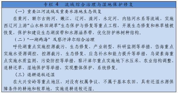 大力推進黃河生態(tài)帶建設,統(tǒng)籌水環(huán)境、水生態(tài)、水資源、水安全、水文化,推進干支流一體化治理,突出抓好十大孔兌、多沙粗砂區(qū)集中來源區(qū)等水土保持治理,實施河道和灘區(qū)綜合提升治理工程,完善水沙調控機制。深化“一湖兩?!奔安旌鼓谞柹鷳B(tài)環(huán)境綜合治理,創(chuàng)新區(qū)域系統(tǒng)治理和流域整體治理舉措,逐步改善生態(tài)環(huán)境。全面加強嫩江、遼河、內陸河水系等流域和達里諾爾、烏拉蓋等濕地生態(tài)保護修復,深入開展地下水超采綜合治理。