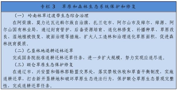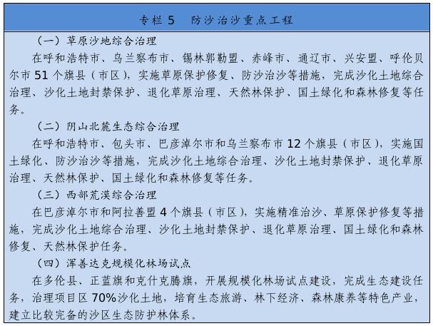 繼續(xù)實施京津風沙源治理等重點工程,推廣庫布其沙漠治理方式和沙產業(yè)模式,推動渾善達克、烏珠穆沁、呼倫貝爾沙地治理。推進規(guī)?;謭鼋ㄔO,采取人工造林、封沙育林、飛播造林等方式恢復植被。建設荒漠綠洲防護林、防風固沙林、沙漠鎖邊林、農田草牧場防護林以及水土保持林。以干旱半干旱草原為重點,加強草場改良和人工種草,實行圍封禁牧、劃區(qū)輪牧、季節(jié)性休牧、舍飼圈養(yǎng)等措施,保護和恢復草原植被。以內蒙古高原等為重點,推進防護林體系建設及退化林修復、退化草原修復、京津風沙源治理。新增水土流失綜合治理3.33萬平方公里。