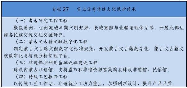 實施文化遺產系統(tǒng)性保護工程,強化重要文化和自然遺產、非物質文化遺產系統(tǒng)性保護,建立整體保護、活態(tài)傳承、創(chuàng)新發(fā)展體系。實施重大文物保護工程,推進長城、黃河國家文化公園和大窯、遼上京、和林格爾土城子等國家考古遺址公園建設。推動萬里茶道(內蒙古段)、遼上京和祖陵遺址、紅山遺址群和陰山巖刻申遺。加強阿爾寨石窟寺等石窟文物保護。開展“中華文明探源”工程、“考古中國”河套地區(qū)早期聚落遺址考古發(fā)掘研究。建設內蒙古非遺博覽園、內蒙古黃河文化博物館、內蒙古工業(yè)博物館。加強紀念館、展覽館、博物館建設管理。推進民族優(yōu)秀傳統(tǒng)手工藝保護傳承和振興,完善非遺名錄體系。實施中華傳統(tǒng)節(jié)日振興工程,開展傳統(tǒng)節(jié)日禮儀禮節(jié)教育活動。