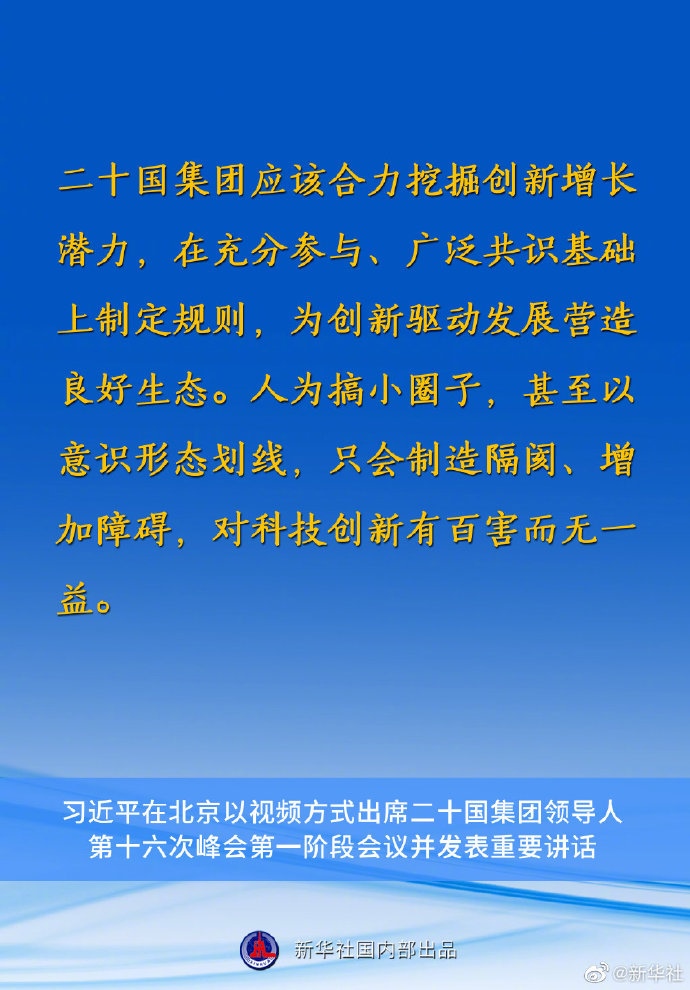 國(guó)家主席習(xí)近平10月30日在北京以視頻方式出席二十國(guó)集團(tuán)領(lǐng)導(dǎo)人第十六次峰會(huì)第一階段會(huì)議并發(fā)表重要講話。講話有哪些要點(diǎn),一起來看↓